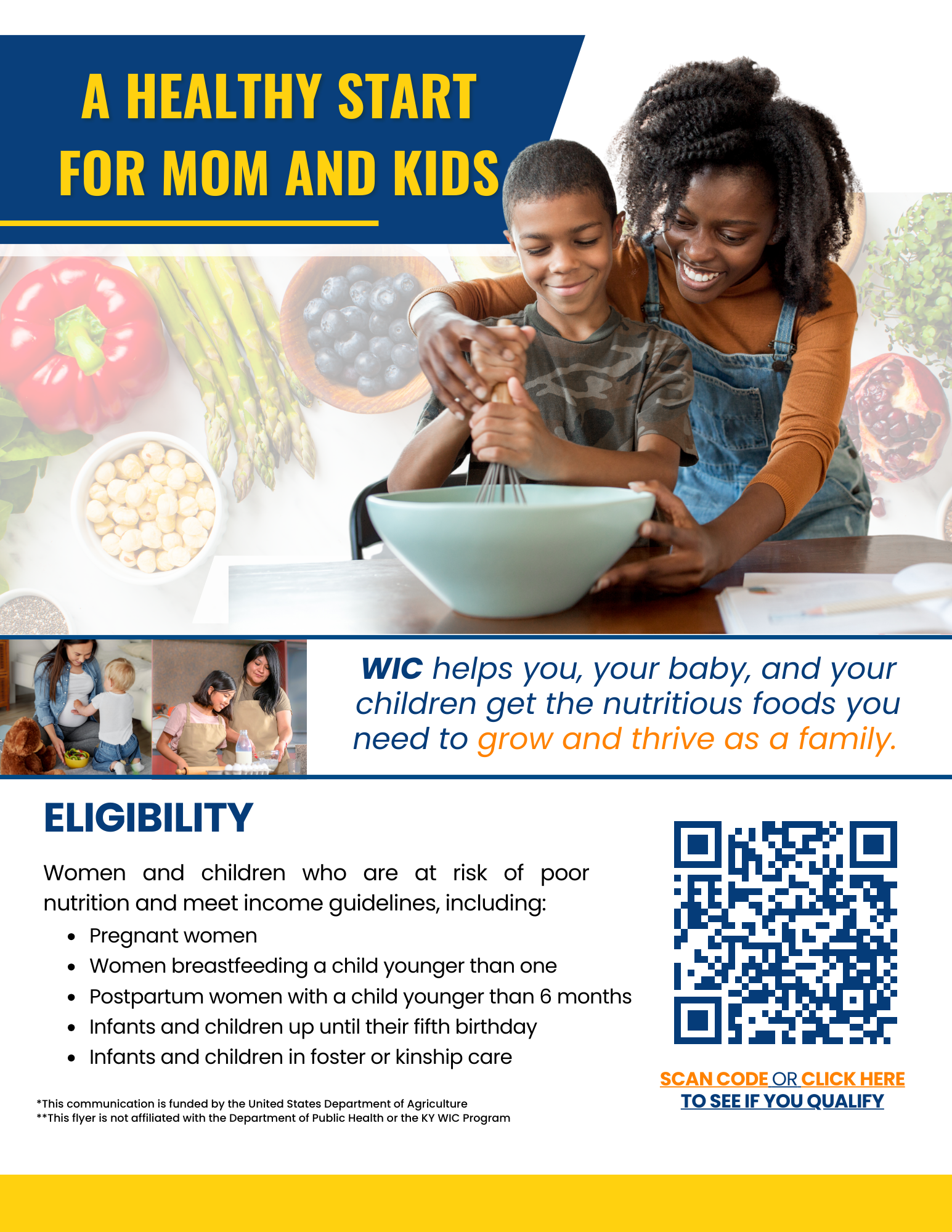 The Special Supplemental Nutrition Assistance Program for Women, Infants, and Children (WIC) helps women, infants, and children get a strong start in life. This program is a lifeline for over 115,000 Kentucky parents, caregivers, and kids, providing them with food benefits through an EBT card, nutrition education, breastfeeding support, and more.