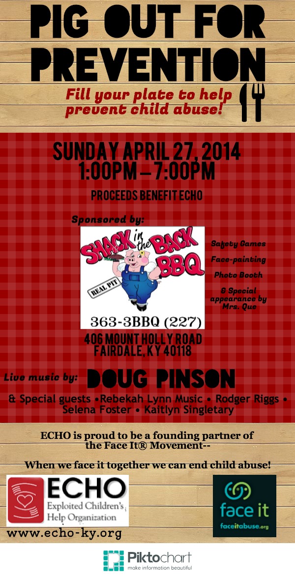 Sunday, April 27 from 1:00pm-7:00pm at Shack in the Back BBQ in Fairdale, KY. This family-friendly event, hosted by Exploited Children’s Help Organization (ECHO), promises to be fun, informative and stocked with great food! Download and share the event flyer, here.
