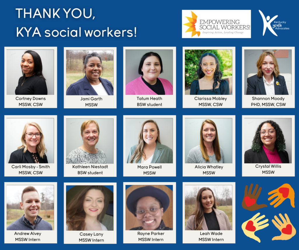 KYA is proud to employ eleven social workers and currently has four social work interns. These social workers work in many settings at KYA, including promoting positive outcomes for children regarding health, economic security, families and communities, and education and through policy advocacy, disseminating data on Kentucky’s kids through the Kentucky KIDS COUNT County Data Book, and program-based efforts with those with lived experience. Our team works in a variety of settings and statewide initiatives to support the needs of kids, such as with foster care and child welfare involvement, justice involvement, kinship caregiver support, education, and prevention of child abuse and Adverse Childhood Experiences, amongst other efforts.