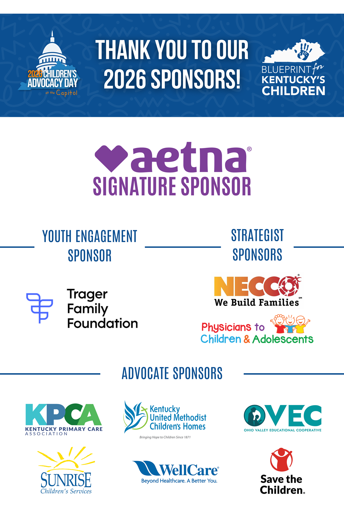 Children’s Advocacy Week is made possible with the support of our many sponsors, including our Signature sponsor: Aetna Better Health of Kentucky, Youth Engagement sponsor: Trager Family Foundation, Strategist sponsors: NECCO and Physicians to Children & Adolescents, Advocate sponsors: Kentucky Primary Care Association, Kentucky United Methodist Children’s Home, Ohio Valley Educational Cooperative, Save the Children, Sunrise Children’s Services, and WellCare, and our many Partner sponsors. We appreciate their support of Kentucky’s largest effort to bring child advocates together.
