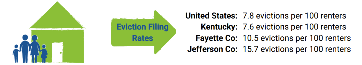 Evictions are both common and devastating for families. While Kentucky has a comparatively low eviction filing rate, Louisville and Lexington both file evictions at a rate much higher than the national average, with Louisville filing evictions at over double the national rate.