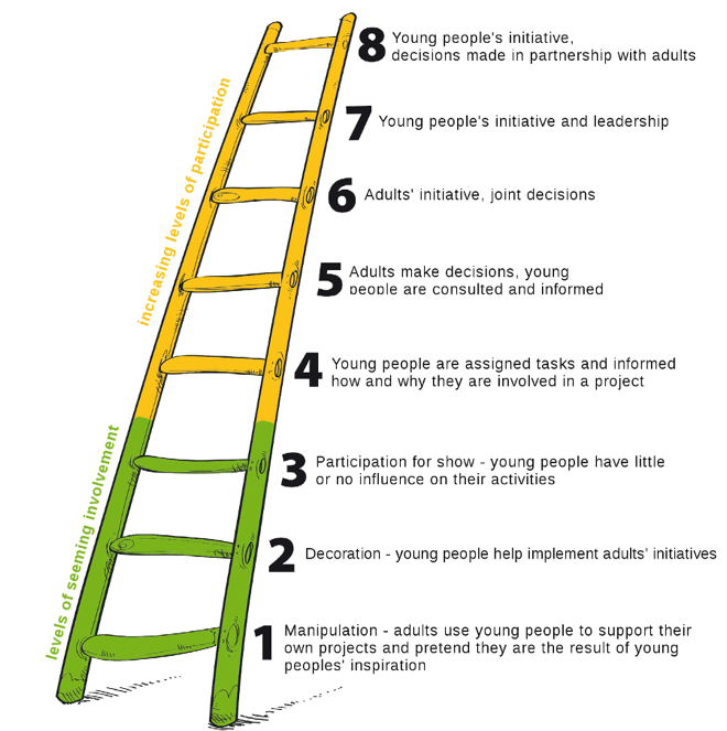 According to Roger Hart’s theory of authentic engagement, the highest level of authenticity is when individuals with lived experience create and drive the initiatives and decisions are made in partnership with agencies. There are reports of young people feeling as though they are selling their stories to fit agencies’ initiatives rather than young people driving initiatives themselves, and instances where young people feel as though they have been invited to the table because they had to be, only to have their ideas/feedback shot down and never implemented (see ‘decoration’ or tokenization).