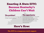 The infographic highlights the important advantages of a state-level EITC in Kentucky and shows that workers, families, and communities all stand to gain from a state EITC. Enacting a state EITC would help keep Kentucky’s children out of poverty by supporting their working parents.