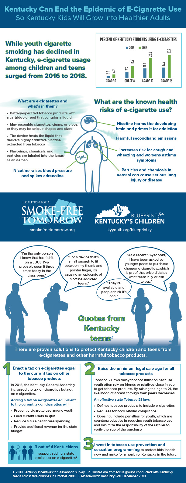Kentucky Can End the Epidemic of E-Cigarette Use Infographic, Jan 2020 By Kentucky Youth Advocates|2023-09-20T15:59:24-04:00January 14th, 2020|Health, Infographics| Kentucky Can End the Epidemic of E-Cigarette Use So Kentucky Kids Will Grow Into Healthier Adults Infographic, Jan 2020 VIEW PDF | VIEW JPG Share This! FacebookXLinkedInPinterestEmail Leave A Comment Cancel replyComment Δ This site uses Akismet to reduce spam. Learn how your comment data is processed.