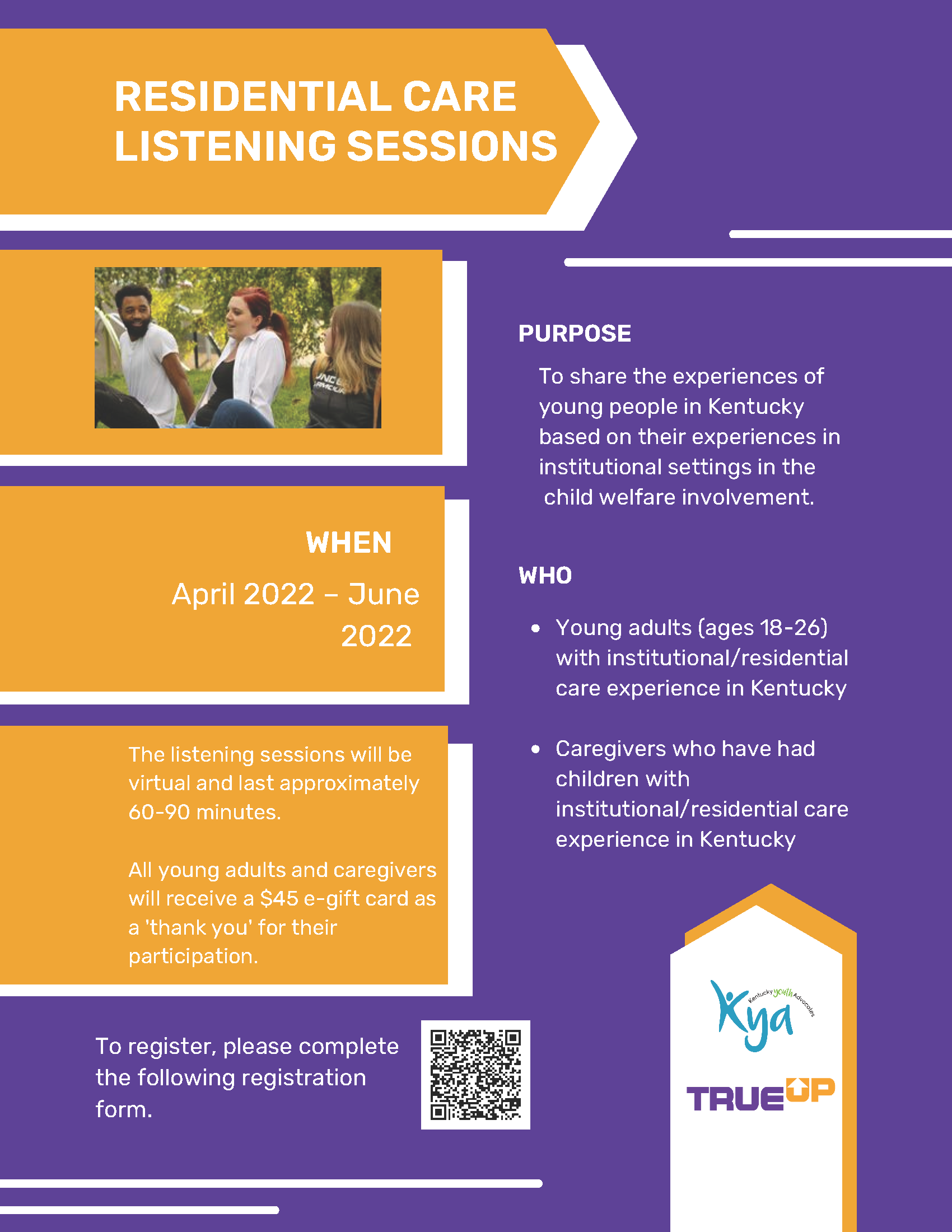 Help us gather insights from young people in Kentucky based on their experiences in institutional settings because of child welfare involvement. Sign up to participate in a listening session HERE.