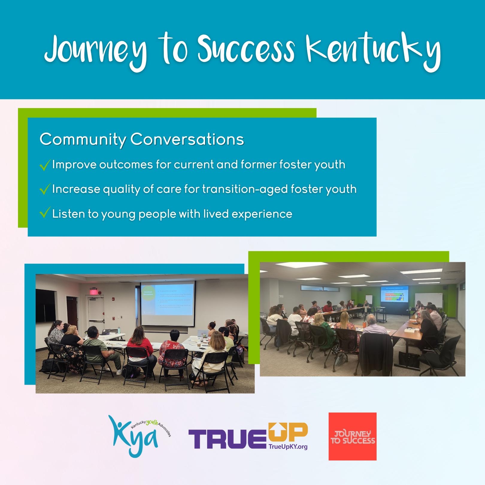 Throughout the Fall, the Journey to Success Kentucky team hosted a number of community conversations with a variety of child welfare stakeholders and foster alumni across the state to present the data and engage in fruitful discussions of action items needed at the program and policy level to increase quality of care for transition-aged foster youth in our state. Themes that emerged from these conversations included: