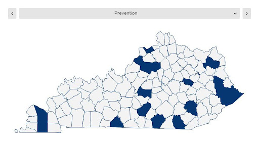 Additionally, Kentucky Youth Advocates partnered with the Kentucky Association of Counties (KACO) to report information on how counties are spending the opioid settlement funds that each county in Kentucky received. Maps in the dashboard show which counties have invested in each of five core strategies: Prevention, Treatment, Recovery Support, Reducing Harm, and Training/Leadership building.
