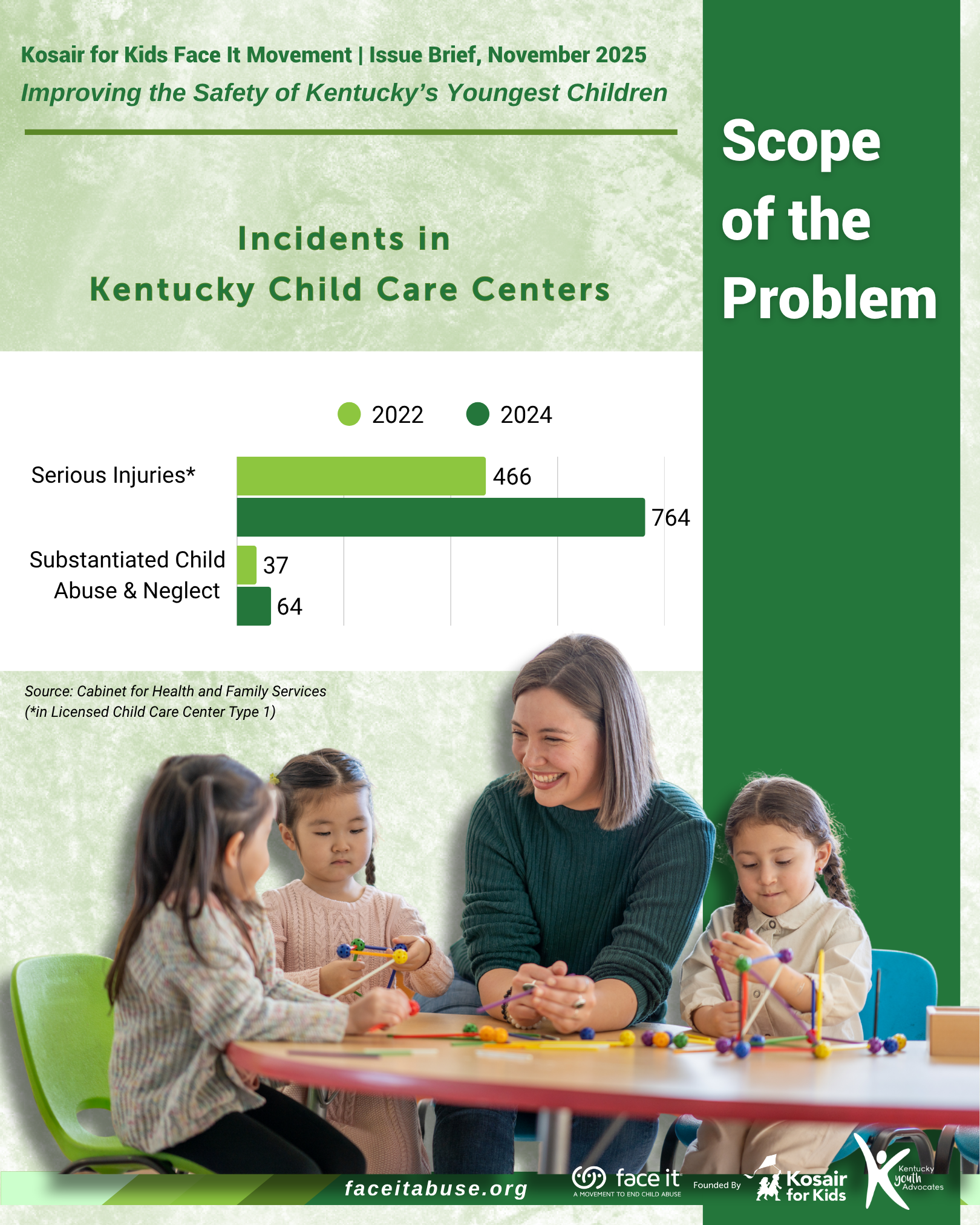 A new issue brief – Improving the Safety of Kentucky’s Youngest Children – released today by the Kosair for Kids Face It Movement and Kentucky Youth Advocates explores the scope of child abuse and neglect in child care centers and provides recommendations to reduce incidents and keep children safe.