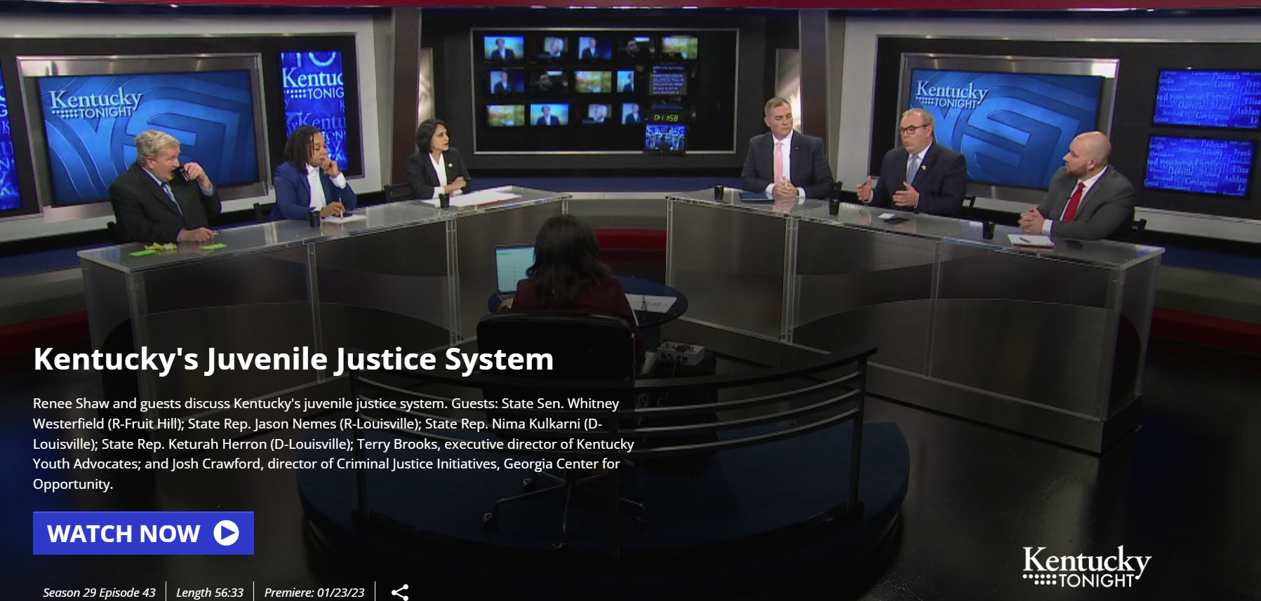 Watch a recent conversation on the juvenile justice system on KET’s Kentucky Tonight featuring Dr. Terry Brooks and members of the General Assembly, including Senator Whitney Westerfield, Representative Jason Nemes, Representative Nima Kulkarni, and Representative Keturah Herron.
