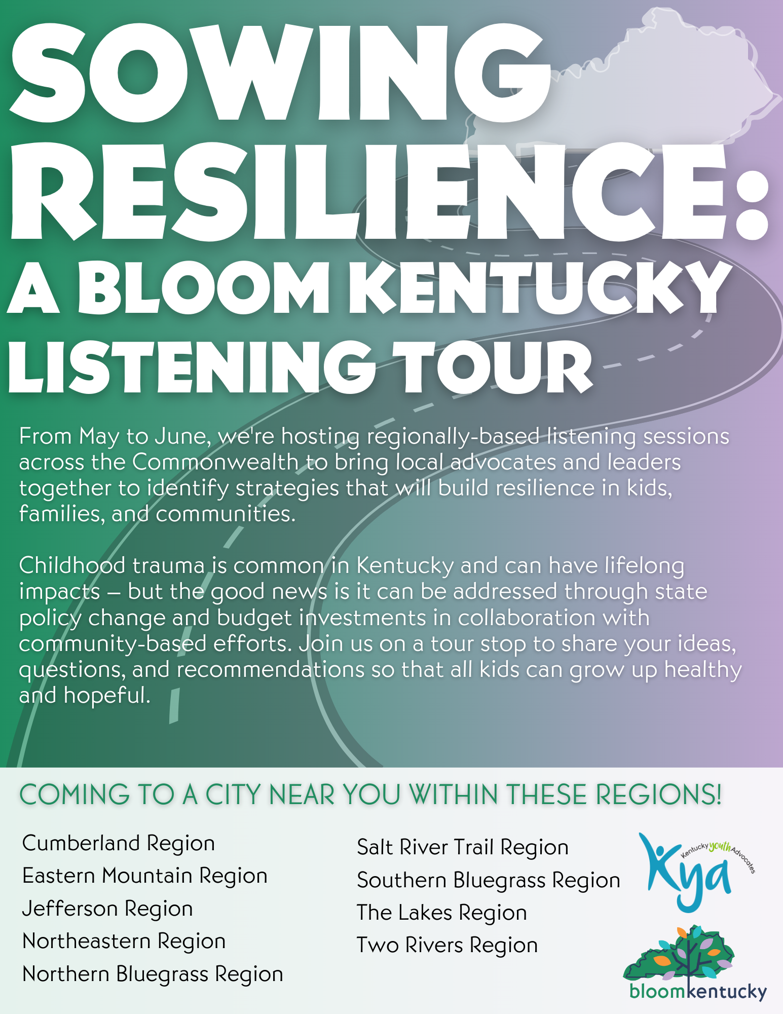 Join Sowing Resilience: A Bloom Kentucky Listening Tour in one of the nine Department for Community Based Services regions to share your ideas, questions, and recommendations so that all kids can grow up healthy and hopeful. We’re partnering with local organizations for the listening sessions – ranging from smaller round tables to large community conversations – and, in some regions, there will be multiple conversations held.