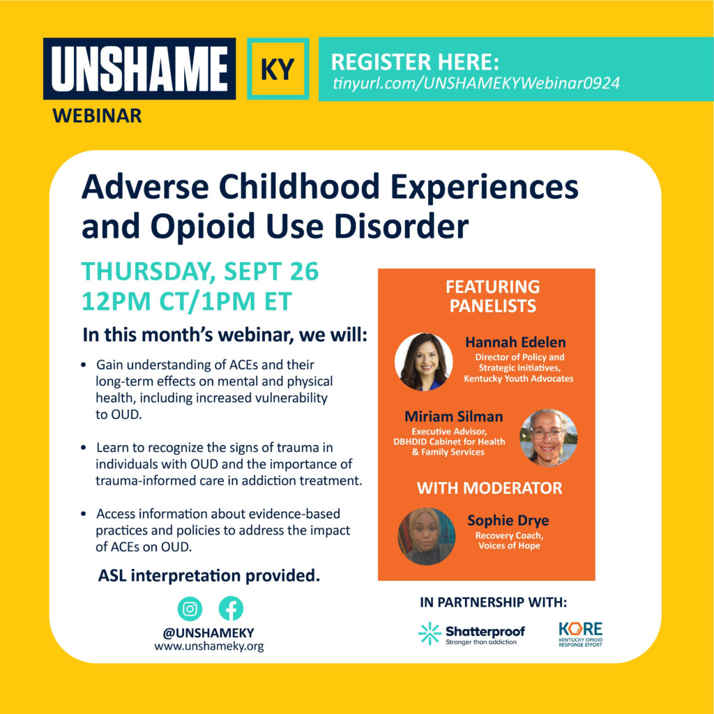 This month, UNSHAMEKY will collaborate with Bloom Kentucky and other organizations to explore the connection between ACEs, substance use, and how we can foster hope through positive childhood experiences and evidence-based practices. By addressing these root causes and promoting healing environments, we aim to reduce addiction-related stigma and provide paths toward recovery.