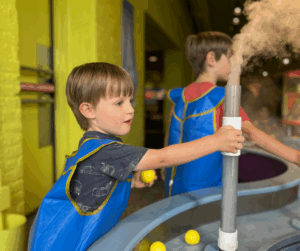 A trip to the Kentucky Science Center with children is like leveling up on curiosity and innovation. My nephews’ favorite part is usually the water table. It’s fascinating to watch how they look at the pipes and water spouts, devise a plan in their brain, then start working to implement what they want to have happen. The joy on their faces is priceless when they figure out their goal – like how to get enough water pressure to pop the ball up into the air and into the water container.
