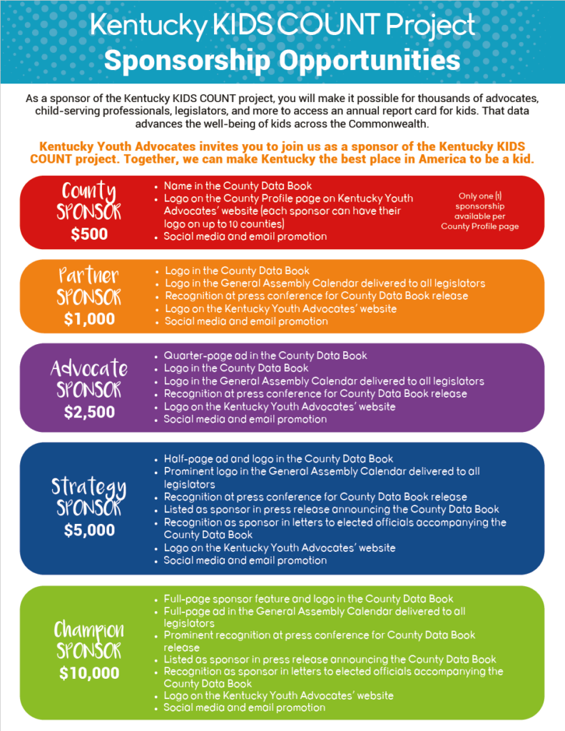 Kentucky Youth Advocates invites you to join us as a sponsor of the Kentucky KIDS COUNT project! Together, we can make Kentucky the best place in America to be a kid.
