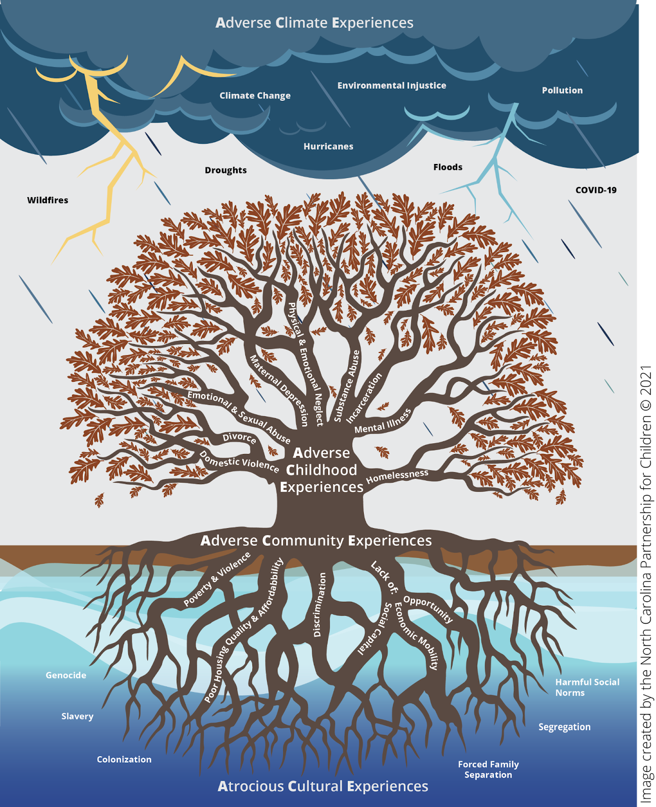 The illustration below, developed by the North Carolina Partnership for Children, highlights how the ACE framework has expanded to include four primary categories of adversity – one of which represented by the storm cloud is adverse community environments.